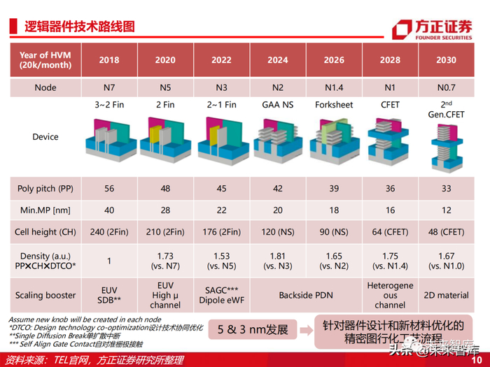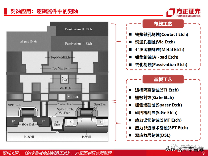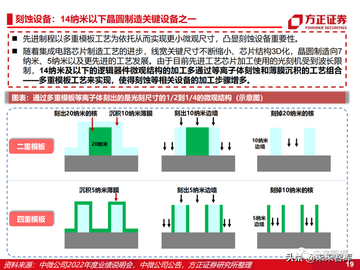 先进制程以多重模板工艺为依托从而实现更小微观尺寸,凸显刻蚀设备重要性。随着集成电路芯片制造工艺的进步,线宽关键尺寸不断缩小、芯片结构3D化,晶圆制造向7 纳米、5纳米以及更先进的工艺发展。由于目前先进工艺芯片加工使用的光刻机受到波长限 制,14纳米及以下的逻辑器件微观结构的加工多通过等离子体刻蚀和薄膜沉积的工艺组合 ——多重模板工艺来实现,使得刻蚀等相关设备的加工步骤增多。