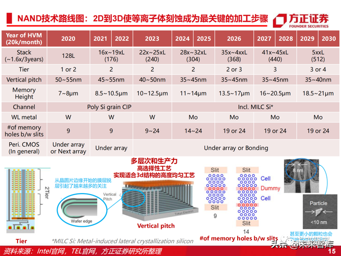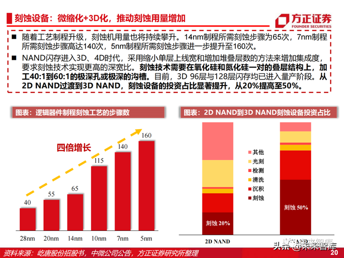 随着工艺制程升级,刻蚀机用量也将持续攀升。14nm制程所需刻蚀步骤为65次,7nm制程 所需刻蚀步骤高达140次,5nm制程所需刻蚀步骤进一步提升至160次。NAND闪存进入3D、4D时代,采用缩小单层上线宽和增加堆叠层数的方法来增加集成度, 要求刻蚀技术实现更高的深宽比。刻蚀技术需要在氧化硅和氮化硅一对的叠层结构上,加 工40:1到60:1的极深孔或极深的沟槽。目前,3D 96层与128层闪存均已进入量产阶段。从 2D NAND过渡到3D NAND,刻蚀设备的投资占比显著提升,从20%提高至50%。