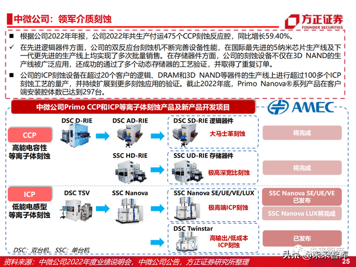 根据公司2022年年报,公司2022年共生产付运475个CCP刻蚀反应腔,同比增长59.40%。在先进逻辑器件方面,公司的双反应台刻蚀机不断完善设备性能,在国际最先进的5纳米芯片生产线及下 一代更先进的生产线上均实现了多次批量销售。在存储器件方面,公司的刻蚀设备不仅在3D NAND的生 产线被广泛应用,还成功的通过了多个动态存储器的工艺验证,并取得了重复订单。公司的ICP刻蚀设备在超过20个客户的逻辑、DRAM和3D NAND等器件的生产线上进行超过100多个ICP 刻蚀工艺的量产,并持续扩展到更多刻蚀应用的验证。截止2022年底,Primo Nanova®系列产品在客户 端安装腔体数已达到297台。