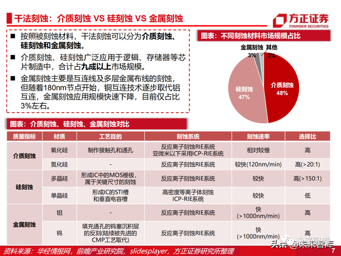 刻蚀概览:刻蚀是半导体器件制造中选择性地移除沉积层特定部分的工艺。在半导体器件的整个制造过程中,刻蚀步 骤多达上百个,是半导体制造中最常用的工艺之一。刻蚀工艺可分为干法刻蚀和湿法刻蚀。目前应用主要以干法刻蚀为主,市场占比90%以上。湿法刻蚀在小 尺寸及复杂结构应用中具有局限性,目前主要用于干法刻蚀后残留物的清洗。根据作用原理,干法刻蚀可分为物理刻蚀(离子铣刻蚀)和化学刻蚀(等离子刻蚀)。根据被刻蚀的材料类型,干法刻蚀则可分为金属刻蚀、介质刻蚀与硅刻蚀,介质刻蚀、硅刻蚀广泛应用于 逻辑、存储器等芯片制造中,合计占九成以上市场规模。