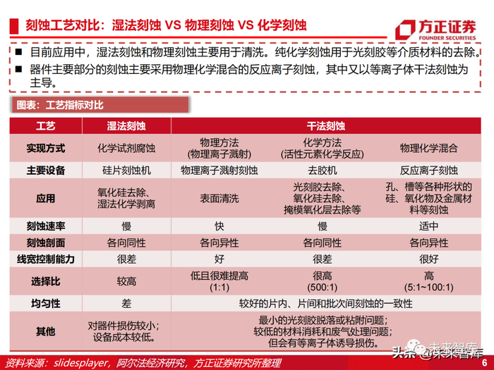 目前应用中,湿法刻蚀和物理刻蚀主要用于清洗。纯化学刻蚀用于光刻胶等介质材料的去除。器件主要部分的刻蚀主要采用物理化学混合的反应离子刻蚀,其中又以等离子体干法刻蚀为 主导。