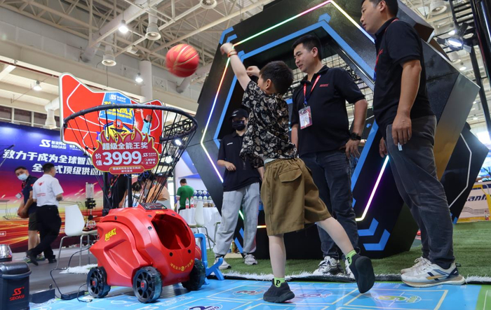 展区内,户外儿童体适能产品普遍呈现出科技感和现代感,大量的科技技术被运用到这些相关产品的开发中。在舒华展区,记者看到一位儿童正在体验体感互动健身设备,他跟随屏幕播放的口令认真地做着动作,很是投入。舒华体育产品经理胡胜杰介绍:“目前儿童产品智能解决方案主要通过电子传感器结合敏捷训练,投篮训练、射门训练等运动,通过光,声反馈,提升儿童锻炼兴趣。”