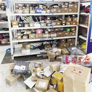 南宁一家菜鸟驿站的货架,放置着不同快递公司送来的包裹。