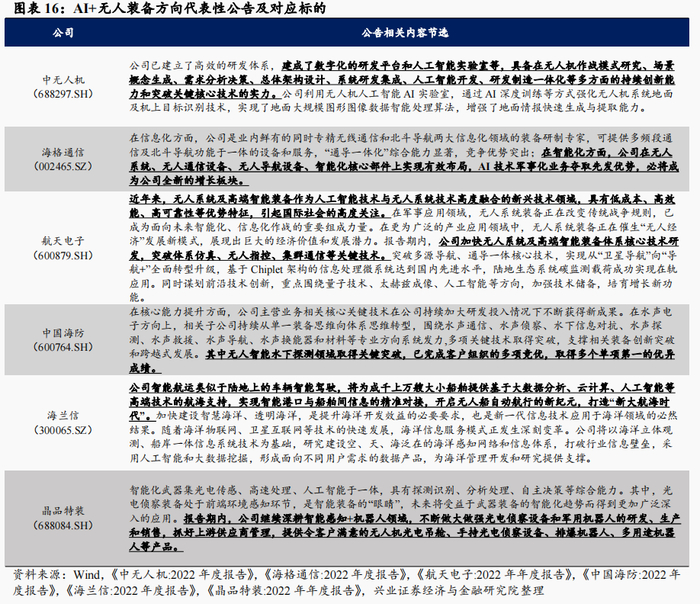 信息化时代开启AI+无人装备新篇章。人工智能技术加快推动国防装备向机械化、信息化、智能化融合发展,无人智能化装备正成为国防装备体系的重要组成部分。目前,人工智能技术在无人机、无人车、无人船、无人通信设备、无人导航设备等军事装备上皆有用武之处。一方面,人工智能技术助力无人机、无人车、机器人为代表的无人武器装备拥有探测识别、分析处理、自主决策等综合能力,这将对作战模式和战场环境带来广泛而深远的影响。另一方面,无人通信设备、无人导航设备则可以通过AI技术增强军事情报快速生成与提取能力。在信息战概念叠加智能军备建设广受重视的今天,AI+无人装备大有可为。