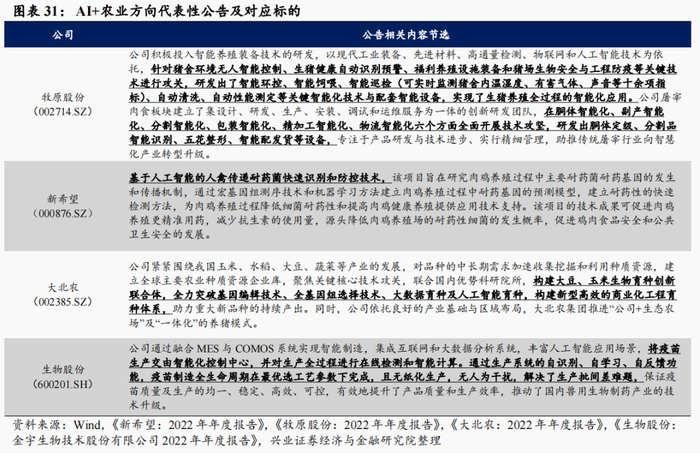 随着智能感知、智能装备、物联网等智能控制系统的应用,农业行业正迎来一次新的变革,智能化农业应用的推广已经成为未来农业发展的必然趋势。目前,AI+农业目前主要应用于智能养殖、人工育种、疫苗生产、智慧水务方面。未来智慧农业有望借 AI 东风,提高农业生产效率和质量,减轻农民的劳动负担,降低资源浪费和环境污染,具体来看:1)在智能养殖方面,以现代工业装备、先进材料、高通量检测、物联网和人工智能技术为依托,对养殖全流程进行智慧管理,包括智能环控、智能饲喂、智能巡检、自动清洗、自动性能测定等关键智能化技术与配套智能设备;2)在人工育种方面,构建大豆、玉米生物育种创新联合体,全力突破基因编辑技术、全基因组选择技术、大数据育种及人工智能育种,构建新型高效的商业化工程育种体系,助力重大新品种的持续产出;3)在疫苗生产方面,疫苗生产将交由智能化控制中心,并对生产全过程进行在线检测和智能计算。通过生产系统的自识别、自学习、自反馈功能,疫苗制造全生命周期在最优选工艺参数下完成,且无纸化生产,无人为干扰,解决了生产批间差难题,保证疫苗质量及生产的均一、稳定、高效、可控,有效地提升了产品质量和生产效率;4)在智慧水务方面,利用互联网+、大数据、人工智能、物联网及云计算等现代信息技术手段,形成一整套高度集合软件、硬件、算法和模型的水行业信息化解决方案。在人工智能技术的应用中,智慧农业的推广也为农林牧渔行业带来了更好的管理手段和更高效的农业生产方式。