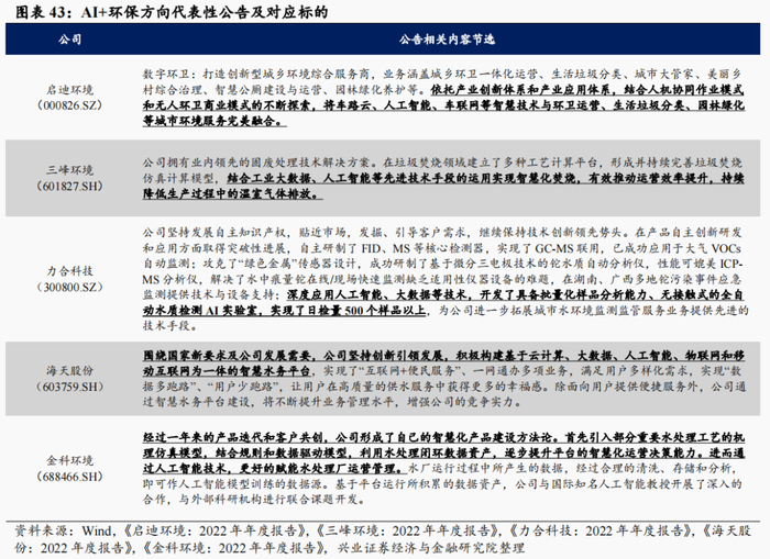 AI为环保行业提供智慧方案,助力实现“绿水青山”。目前,AI与环保行业的结合主要应用于环卫、环境监测和水治理。1)环卫方面,将环卫常用设备如环卫车同AI相结合,利用AI的识别和分析能力实现环卫工作的“无人化”。2)环境监测方面,通过人工智能的数据处理和分析能力对环境数据进行实时监测,持续降低污染物和有害物质水平。3)AI+水治理方面,将人工智能技术运用与水厂运营中,一方面管理调控水指标,另一方面根据用户需求调度水务,提供便利。在AI技术的帮助下,人工智能能够更加高效和全面地处理环境数据,并提供科学的预测,助力行业快速发展,迎来碧水蓝天。