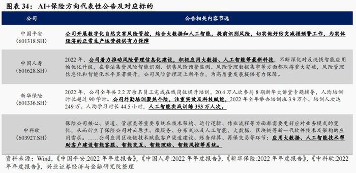 AI成为保险行业降本增效的重要推手。AI技术为保险行业带来的降本增效作用主要体现在风险识别、公司运营、员工培训与客户服务方面。具体来看:1)在风险识别,结合大数据和人工智能,提前识别风险,提前预警,减少保险赔付次数;2)在公司运营方面,以大数据为技术全面推动经管数字化转型步伐,让科技创新成为公司长期发展的动力。3)在人员培训方面,外勤培训聚焦个险,公司人工智能实战训练达353万人次。4)在客户服务方面,AI助力保险公司顺利应对业务模式变化,为保险业务与客户服务赋能。AI的应用,不仅能提高运营水平与实力,还能预测风险,降低成本。