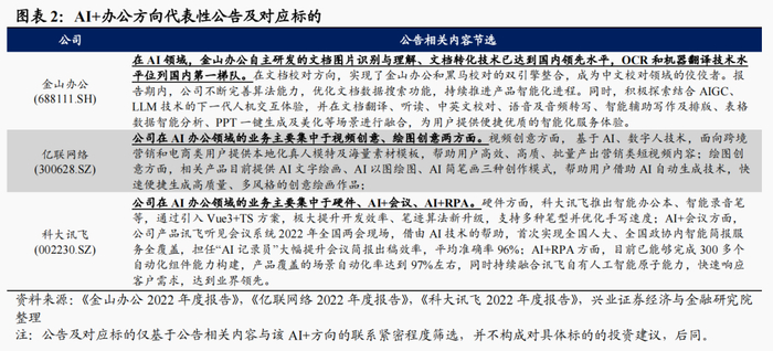 生成式AI赋能办公场景,降本提效重塑办公模式。目前,AI技术能从三个维度帮助企业重塑办公模式,赋能办公场景。具体来看:1)在内容生成方面,生成式AI 拥有强大的数字内容孪生、编辑、创作能力,三大核心能力有望实现办公产业文本生成的可能,在大大提升企业效率的同时,有望降低一定人力成本;2)在人机交互方面,生成式AI提升了人机交互能力,改变了信息交流的方式,使用户通过与智能助手的对话实现更多功能,提升企业工作效率;3)在处理非结构化数据方面,非结构化数据指数据结构不规则、不易用二位逻辑表示的数据,传统企业在处理这类数据时往往需要花费大量时间精力,且成本高昂。在AI技术的帮助下,人工智能能更加高效的处理此类数据,在提高企业数据处理效率的同时,帮助企业开源节流。综合来看,在生成式AI的帮助下,办公模式将得以重塑,企业办公效率将会大幅提高,相关成本也将有所下降,AI+办公的新模式有望成为大势所趋。