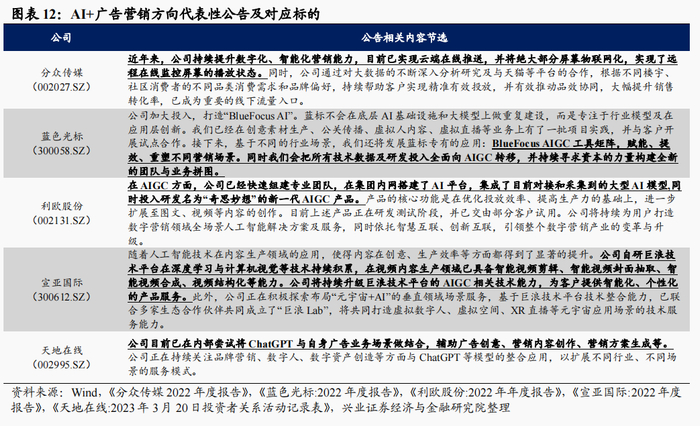 从广告生成到营销投送,AI+全方位助力广告营销。人工智能技术从广告创意、营销内容生成、营销场景投送等角度辅助广告营销公司。1)在广告创意方面,一方面,AI技术扩展了传统的广告营销方式,并通过高速阅读能力广泛融合各类资源,辅助创意素材生产,另一方面,大模型和虚拟人的出现,使得营销公司能够利用这些工具博得用户的眼球。2)在营销内容方面,营销公司可以利用AI高效攫取内容产业价值,辅助内容营销创作与营销方案生成,3)在营销场景投送方面,广告商能够通过AI技术有效的对用户进行数据分析、用户洞察,达到精准、创意的投放,为用户提供智能化、个性化的产品,塑造品牌价值。人工智能通过扩展图文、视频内容,为客户提供智能化、个性化、创意化服务,AI+广告营销潜力可期。