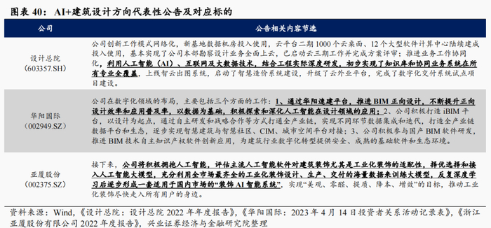 通过更高效地生成和优化设计方案,AI赋能有望为建筑设计行业提质增效。目前,AI+建筑设计目前主要应用于方案设计阶段,初步设计、施工图设计阶段应用相对较少。未来建筑设计有望借 AI 东风,提升人效、降低成本,具体来看:1)在方案设计阶段,AI 算法能够对海量数据和图像进行深度学习,汲取多个优秀设计案例的经验,从而快速生成多个较为合理的设计方案供设计师选择;2)在初步设计阶段,人工智能能够通过算法快速优化平面图布局,节省建筑面积,优化建筑流线,降低工程造价等;3)在施工图设计阶段,AI 技术能够使得各方协同效率提升,BIM+AI 技术有助于各环节人员协同效力,建筑、结构、水电暖通各专业沟通更加便捷。在 AI 的冲击下,更高效的绘图可以带来人均创收的大幅提升,减少基础绘图人员数量,降低人员薪资的成本,为行业带来降本增效。