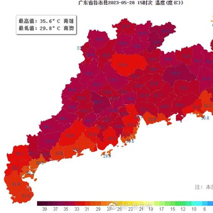 29日到30日,广东大部天气晴热为主,午后局地有短时(雷)阵雨。最高气温:南部沿海市县31℃~33℃,其余大部分市县有35℃-37℃高温天气,部分市县可达38℃~39℃。