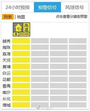 广州各区高温黄色预警信号正在生效中。