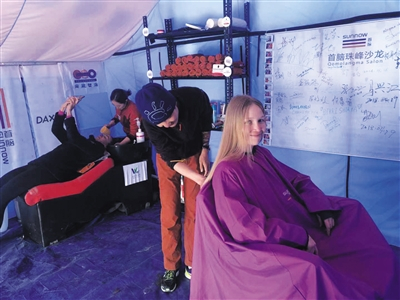 他找来人,把洗头床、剪发镜台、热水器、发电机、纯天然无污染的洗发水、毛巾都运到了珠峰大本营。