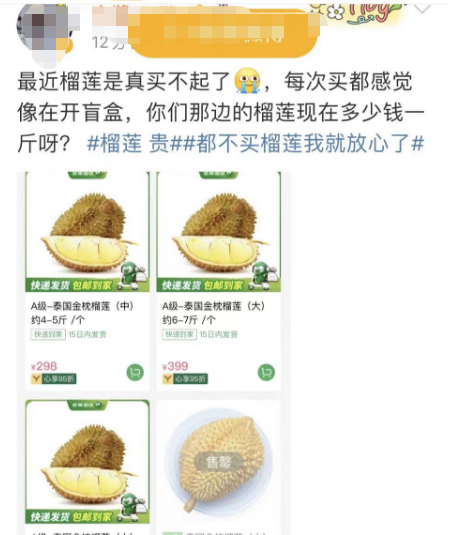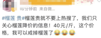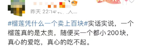 近日,榴莲贵冲上热搜,短短几个字,却铿锵有力,击碎一众“榴莲价格敏感型用户”的心。