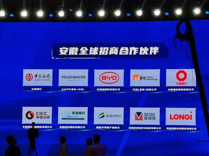 5月28上午,以“投资安徽与机遇同行”为主题的“投资安徽行”系列活动启动大会在合肥举行。当日,安徽省政府发布了安徽全球招商合作伙伴,分别为:中国银行、大众汽车集团(中国)、比亚迪股份有限公司、华润(集团)有限公司、中国建材集团有限公司、中国国际金融股份有限公司、赛迪顾问股份有限公司、国际半导体产业协会、深圳市创新投资集团有限公司、隆基绿能科技股份有限公司。