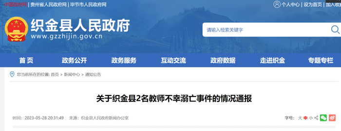 5月28日,贵州织金县人民政府网发布关于织金县2名教师不幸溺亡事件的情况通报。详情如下: