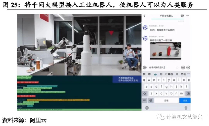 阿里采用和微软相似的路径,正在实验将千问大模型接入工业机器人。在近日举行的第六届数字中国建设峰会上,阿里云发布一个演示视频中展示了千问大模型的实际应用场景。其中,千问大模型接入了工业机器人,工程师通过钉钉对话框向机器人发出指令后,千问大模型在后台自动编写了一组代码发给机器人,机器人开始识别周边环境,从附近的桌上找到一瓶水,并自动完成移动、抓取、配送等一系列动作,递送给工程师。在钉钉对话框输入一句人类语言即可指挥机器人工作,这将为工业机器人的开发和应用带来革命性的变化,其背后意味着大模型为工业机器人的开发打开了新的大门。因为千问等大模型为机器人提供了推理决策的能力,从而有望让机器人的灵活性和智能性大幅提升。