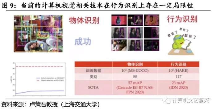 深度学习框架在行为认知中遇到了瓶颈。因为深度学习得到长足发展,计算机视觉领域有两个要素,一个是以物体为中心的感知,一个是以人为中心的感知。配合不断进化的深度学习算法,复杂物体识别可以十分成功,但是要机器明白从人类视角的这个行为的真实语义,却十分困难。市场表现来看也是如此,很多商用产品都是基于物体检测,行为理解的产品都是很少的。之所以人为中心的感知十分困难,是因为深度学习本身达到了瓶颈。根据卢策吾教授的研究结果,行为识别的SOTA要远低于物体识别。