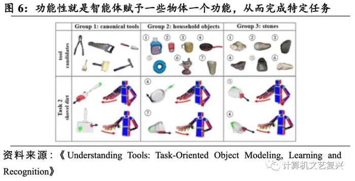 具身智能还要具有功能性。具身智能在把物体作为工具使用的过程中,要能够以任务执行为导向去理解功能。从智能体来理解世界,核心就在于任务——改变实体状态,是任务实现来驱动智能体的。例如,在解决 “铲土”任务过程中,需要实现用不同的工具去铲土,比如杯子、铲子、平底锅等,都要能够让智能体实现“铲土”这个任务。因此,具身智能的功能性就是赋予了物体一个功能,用来解决某个特定任务。