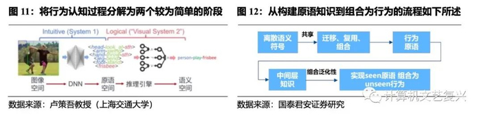 将行为认知问题分解为感知到知识、知识到推理融合的两个较为简单的阶段,是一个较优的科学路径。离散语义符号是被不同行为所共享的,比如吃饭、读书和打扫都有着“手-握-某物”的标签,通过对这些共享标签的迁移、复用和组合,可以形成行为原语,从而构造“中间层知识”,这种组合可以有着一定的泛化能力,即通过原语组合,机器可以做出没见过的行为。