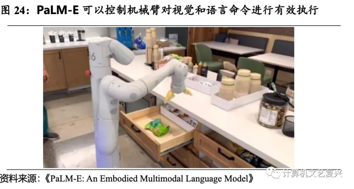 谷歌实现视觉语言与机器人高水平实时互联,且观察到了类似多模态思维链推理与多图像推理等涌现能力的出现。基于语言模型,PaLM-E 会进行连续观察,例如接收图像或传感器数据,并将其编码为一系列与语言令牌大小相同的向量。因此,模型就能继续以处理语言的方式“理解”感官信息。而且,同一套PaLM-E模型能够达到实时控制机器人的水准。PaLM-E 还展现出随机应变的能力,例如尽管只接受过单图像提示训练,仍可实现多模态思维链推理(允许模型对包含语言和视觉信息在内的一系列输入进行分析)和多图像推理(同时使用多张输入图像进行推理或预测)。但谷歌展示的Demo中的空间范围、物品种类、任务规划复杂度等条件还比较有限,随着深度学习模型愈发复杂,PaLM-E也将打开更多可行性应用空间。