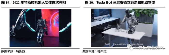 Tesla Bot功能进展迅速,商业化前景可期。2021年,在“特斯拉AI日”上,马斯克发布了特斯拉的通用机器人计划,并用图片展示了人形机器人Tesla Bot的大致形态。但当时的Tesla Bot只是个概念。一年后在2022特斯拉AI日上,人形机器人擎天柱(Optimus)实体亮相。2023年5月中旬的特斯拉股东大会上,马斯克又展示了Tesla Bot的最新进展,现在Tesla Bot已经可以流畅行走,并还能灵活抓取放下物体。马斯克在会上表示“人形机器人将会是今后特斯拉主要的长期价值来源。如果人形机器人和人的比例是2比1,则人们对机器人的需求量可能是100亿乃至200亿个,远超电动车数量”。
