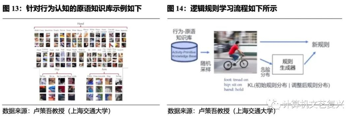 因此,构建海量原语知识以及逻辑规则库是首当其冲的工作。人类理解行为的基本原因,约等于人类各个部件在干什么事情,因此首先得构建大量的基于人类局部状态的原语知识,并能识别它们。其次,有了好的原语检测,之后就需要对它们进行编程,实现逻辑规则引导下的数据驱动学习,但这里容易出的问题是,规则是人类自己认为的,如果规则库错了就会有很大的影响,因此规则学习是解决该问题的办法。具体流程是,在行为原语知识库中随机采样,形成对该行为的判断,然后基于人类给的先验起始点去搜索,规则空间采样,若准确率提高就加上规则,不然就删掉该规则,通过调整后的规则分布形成新规则。卢策吾教授发现,以“人骑车”图像为例,经过以上技术流程,机器可以在未见过的“骑车规则”中自动识别出“骑车”这个行为,所以该技术路线可以有效逼近行为识别的人类性能。