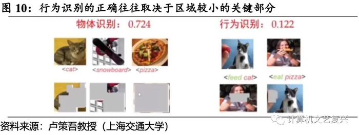 行为理解的关键是要在极大语义噪声中提取行为理解要素。行为是一个抽象概念,因而需要在图像中捕抓行为相关要素。要衡量图像的语义判断区间,可以用语噪比(语噪比=支撑语义判断区间/全图像区间)来刻画,即抹去图像上的某个区域使得其他人无法识别出行为类型的最小区域。卢策吾教授团队通过计算发现,物体识别的语噪比要远大于行为识别,这意味着遮住较大区域仍可以识别物体,但哪怕遮住一小块区域就无法识别行为。因此,可以得出结论,行为理解的关键是要在极大语义噪声中提取行为理解要素,也就是需要在很大干扰情况下,真正挖掘图像的真实语义。而这个工作是无法通过增加深度学习的工作量来达到的。