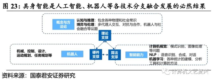 而多模态大模型为具身智能的技术瓶颈突破提供了重要驱动力。具身智能是人工智能、机器人等各技术分支融合发展的必然结果,因为计算机视觉为图像的采集和处理打开了窗口,图形学也为物理仿真提供了工具支撑,NLP也为人类-机器交互提供了便捷性,也为机器从文本中学习知识提供了有效途径,认知科学也为具身智能的行为认知原理提供了科学研究途径。各类机器人构件也为智能体与物理环境交互提供了桥梁。因此,人工智能的技术分支以及机器人功能性的提升,为具身智能的进一步发展带来了可能,而当前AIGC时代的大模型可以将之前的技术分支更优地集成和创新,已有不少研究者尝试将多模态的大语言模型作为人类与机器人沟通的桥梁,即通过将图像、文字、具身数据联合训练,并引入多模态输入,增强模型对现实中对象的理解,从而更高效地帮助机器人处理具身推理任务,一定程度提升了具身智能的泛化水平。所以,GPT等AI大模型为具身智能的自我感知和任务处理的优化升级提供了新的研究手段。
