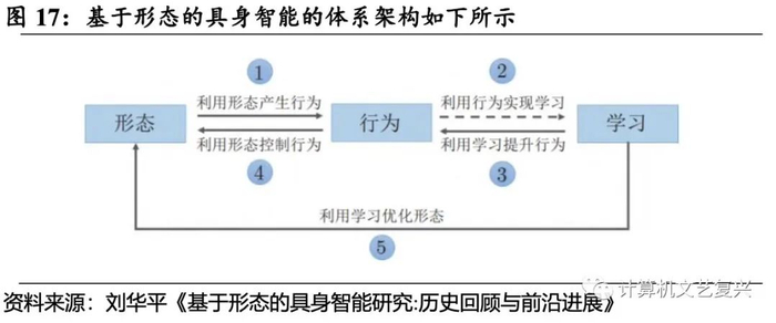 执行行为需要涉及到形态、行为和学习的体系化交互。在基于形态的具身智能中, 形态、行为与学习之间的关系密切。首先,需要利用形态产生行为,该过程重点强调利用具身智能体的形态特性巧妙地实现特定的行为, 从而达到部分取代“计算”的目的。其次,需要利用行为实现学习,重点强调利用具身智能体的探索、操作等行为能力主动获取学习样本、标注信息,从而达到自主学习的目的,此领域当前属于研究前沿。再者,需要强调利用学习提升行为以及利用行为控制形态,后者有多种实现方法,但当前利用学习手段来提升行为,并进而控制形态的工作是现代人工智能技术发展起来后涌现出来的新型智能控制方法,特别是基于强化学习的技术已成为当前的热点手段。最后,具身智能需要利用学习来优化形态,强调利用先进的学习优化技术实现对具身智能体的形态优化设计。