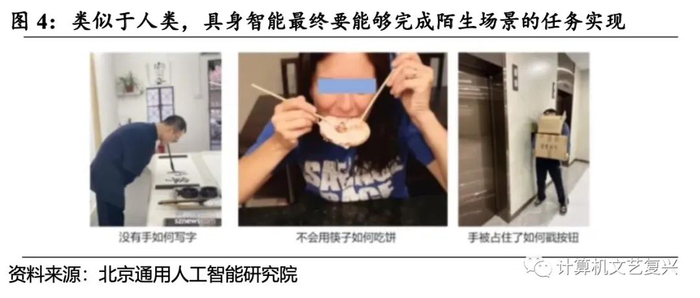 所以,计算机视觉和NLP更多是具身智能的工具,而通用人工智能才是具身智能的终极目标。具身智能要能够实现使用身体(各个部位)完成物理任务的一些现象,比如外国人不会用筷子,但仍能叉起来吃东西,因此具身智能也要通过物理环境完成任务的过程中,表现出完成之前没有覆盖的场景。所以,根据具身智能的特点可以研判,如同经典力学领域的速度、动量、弹性等概念奠基了物理学领域,驱动了后续科学的发展,同理,具身智能因其实现了知识、概念、可解释以及行为因果关系,其有望成为通用人工智能的驱动力。
