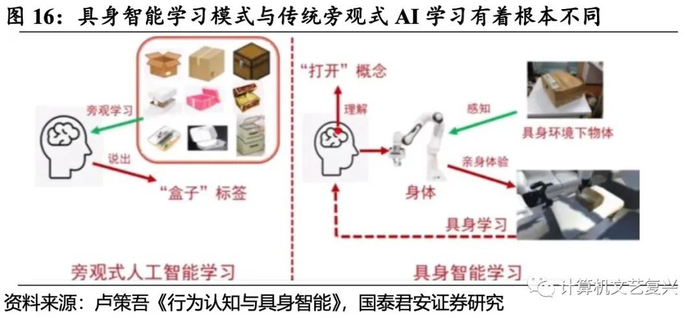 不仅仅理解行为,更需要能执行行为,机器能够执行行为才是真正理解行为。通过计算机视觉以及行为认知识别,让机器能够确认和分辨一个行为仅仅只是第一步,这也只是传统旁观式AI学习所达到的功能水平,例如,传统AI学习可以让机器学习“盒子”概念并在新的场景中说出“盒子”这个标签,但在具身智能学习模式中,机器通过感知环境实体,通过亲身体验完成具身学习,最终理解场景并形成“打开”这个概念。因此,当机器可以执行该行为才是具身智能的落脚点。