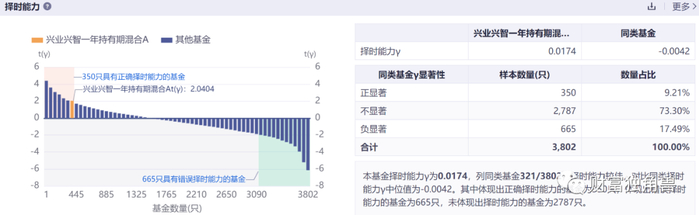 而兴业兴智一年持有期混合A择时能力γ为0.0174,列同类基金321/3802,择时能力较佳,对比同类择时能力γ中位值为-0.0042。其中体现出正确择时能力的基金为350只,体现出错误择时能力的基金为665只,未体现出择时能力的基金为2787只。
