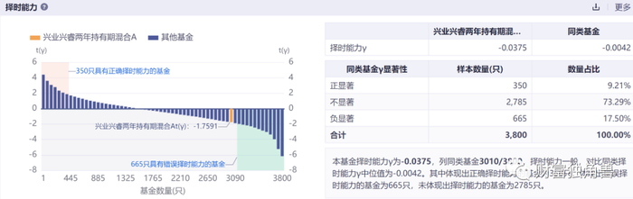 而兴业兴睿两年持有期混合A本基金择时能力γ为-0.0375,列同类基金3010/3800,择时能力一般,对比同类择时能力γ中位值为-0.0042。其中体现出正确择时能力的基金为350只,体现出错误择时能力的基金为665只,未体现出择时能力的基金为2785只。