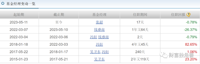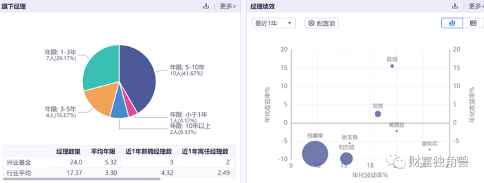 值得注意的是,在经理绩效栏可以看出,近1年来一些基金经理的业绩并不好,年化收益维持正收益的只有陈旭和皱慧,而钱睿南、刘方旭、徐玉良、蒋丽丝、廖欢欢的年化收益率跌至负值分别为:-7.47%、-10.09%、-5.94%、-2.31%、-5.99%。