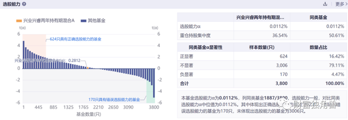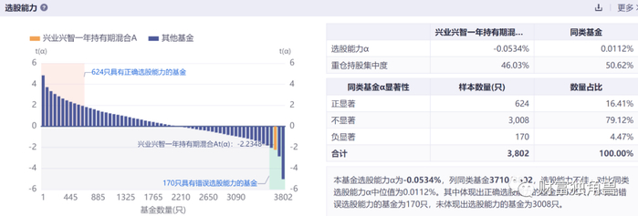 我们也可以通过数据比对来分析一下,据同花顺数据显示,兴业兴睿两年持有期混合A的选股能力α为0.0112%,列同类基金1887/3800,选股能力一般,对比同类选股能力α中位值为0.0112%。其中体现出正确选股能力的基金为624只,体现出错误选股能力的基金为170只,未体现出选股能力的基金为3006只。