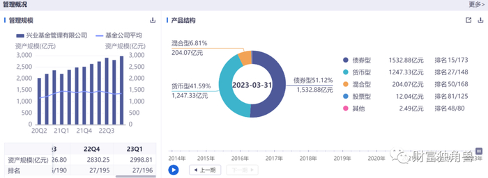 据同花顺显示,截至2023年3月31日,公司在管规模2998.52亿元,相比同期增长了13.72%。其中,债券型和货币型基金合计规模为2780.21亿元,占比92.72%;股票型和混合型基金合计规模约218.31亿元,占比仅为7.28%。然而,作为兴业银行旗下子公司,尽管依靠银行享有资金优势,但权益类产品占比规模相对较少。