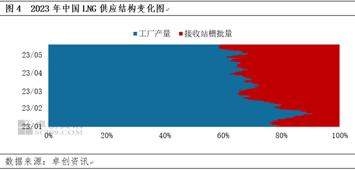 2023年以来,受到国际天然气市场供应宽松、价格下行等因素影响,国内LNG进口量明显增加,接收站槽批出货量同步提升,这不仅导致了国内LNG市场供应总量的提升,还带来了供应结构的转变。后市来看,海气对LNG市场的供应、价格仍将保持较强的影响,国内LNG市场海陆资源竞争或将日益加剧。