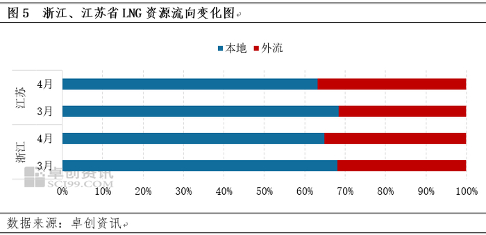 就沿海省份而言,现货进口价格的回落使多数接收站得到了充足的让利空间以刺激出货量,同时海气价格优势再次显现,接收站液源辐射范围迎来扩大之势。以华东为例,据卓创资讯统计,4月,浙江省LNG资源的外流占比为35%,较上月提升了3个百分点,较去年同期提升了12个百分点;江苏省LNG资源的外流占比约为37%,较上月提升了5个百分点,较去年同期提升了33个百分点,江浙的液源开始越来越多地补充到安徽、福建、江西甚至两湖等地。