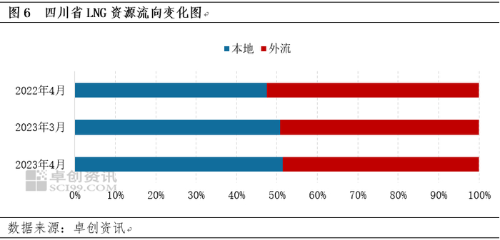 就内陆以资源流出为主的省份而言,海陆价差的缩小使LNG工厂不再具备明显的跨区域套利空间,陕西、四川等大量依赖外部需求的省份正在面临日益增大的出货压力。以四川省为例,据卓创资讯统计,4月份,四川省LNG资源外流占比约为48.51%,较上月下降了0.66个百分点,较去年同期下降了近4个百分点。