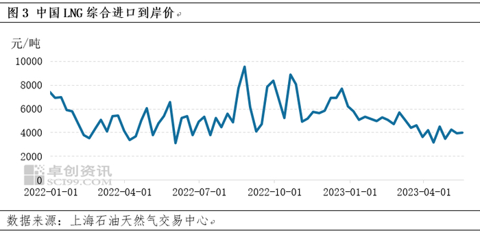 LNG进口成本回落,船期到港量增加。2022年由于欧洲溢价,部分长协资源流转向国际市场,今年这种现象已趋近于无,此外,在国际价格下行的过程中,部分进口企业还进行了少量现货资源的采购,国内部分“第二梯队”企业对国际现货资源的询价与采购积极性提升,LNG进口资源量整体有所回升。据卓创资讯船期数据统计,截至5月22日,我国5月份船期到港量约为438.2万吨,环比4月份同期增加21.45%,同比增加20.48%。