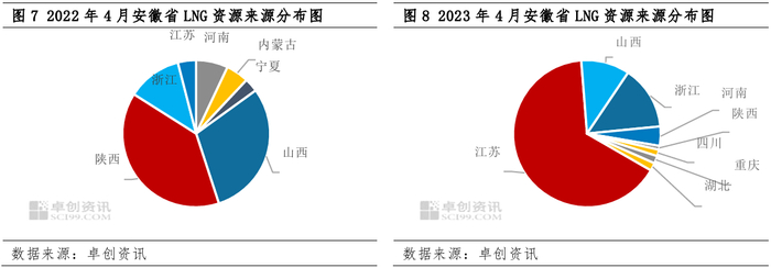 就以资源流入为主的省份而言,接收站出货量的恢复改变了其在2022年主要依赖液厂供应的情况,尤其是中部区域有了更多的选择。以安徽省为例,4月,来自江苏、山西、浙江、河南、陕西、四川、重庆、湖北的LNG资源共同保障安徽省消费的满足,其中,海气供应已经开始承担主导责任,来自江苏的液源流入量以65%的占比位居首位;与之相比,去年同期安徽液源仅包括河南、内蒙古、宁夏、山西、陕西、浙江、江苏,其中海气资源仅占16%,而来自陕西的资源辐射量以39%位居首位。