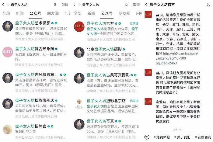 以“盘子女人坊”为关键词搜索公众号,会出现一个账号矩阵,除了官方主账号之外,各区域、各城市,甚至各类产品线都有自己专门的子账号。用户关注账号之后,自动问候程序会引导用户留下相关联系方式。