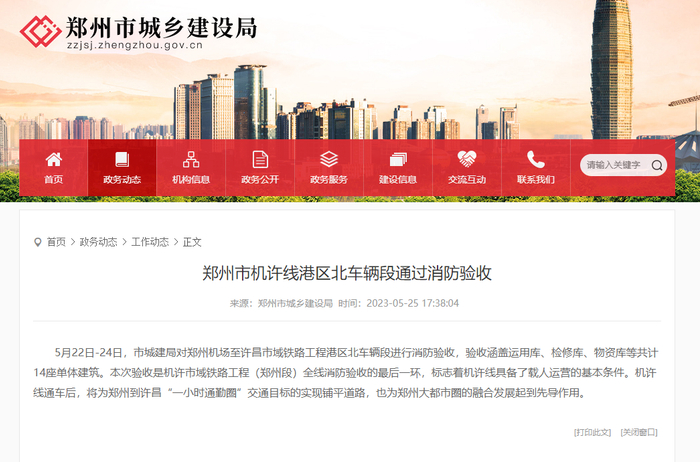 5月25日,郑州市城乡建设局发布消息,5月22日—24日,该局对郑州机场至许昌市域铁路工程港区北车辆段进行消防验收,验收涵盖运用库、检修库、物资库等共计14座单体建筑。