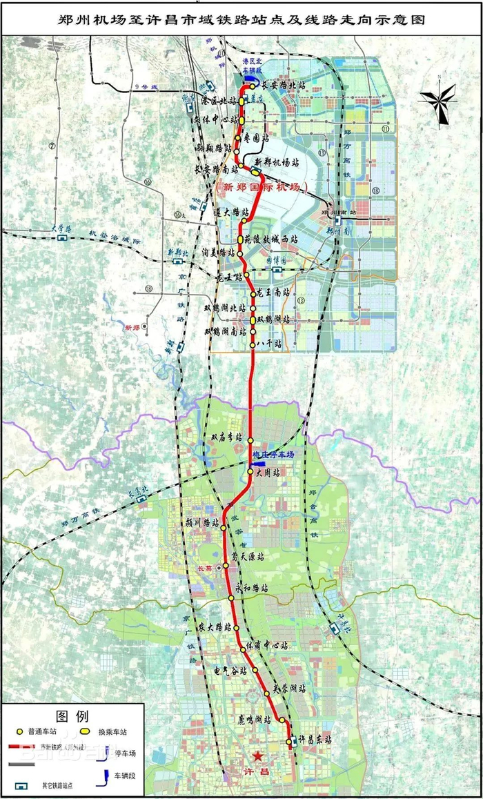 郑许市域铁路南端以许昌东站为起点,北至郑州航空港区长安路北站,线路全长67.1公里,全线共设27座车站,设计时速为120千米;全线共设港区北车辆段、梅庄停车场1段1场;列车前期采用4节编组B型列车,后期将根据实际情况采取采用4节编组B型列车和采用6节编组B型列车混跑 。
