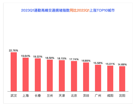 2023年第一季度,百城中近八成城市通勤高峰交通拥堵指数同比2022年第一季度呈上涨趋势,涨幅TOP3城市依次为武汉、上海、长春。