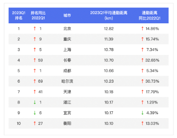 百城中55%的城市2023Q1通勤距离均有所增加,通勤距离榜TOP10城市中,九城通勤距离同比上涨,其中⻓春、哈尔滨的同比涨幅超30%。