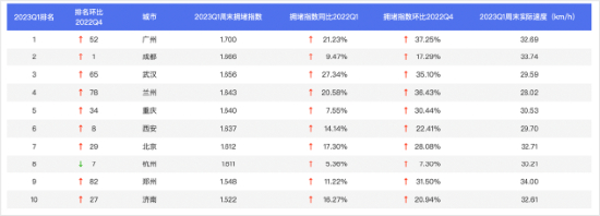 环比2022年第四季度,广州、武汉、兰州、重庆、北京、郑州、济南重新进入周末拥堵TOP10榜单。其中,广州、武汉、兰州的拥堵指数环比超35%、同比超20%。