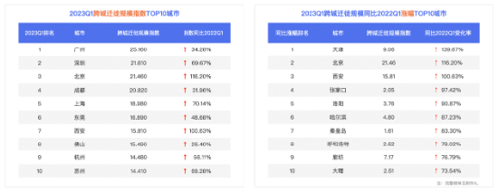 人口流动与交通的发展密不可分。同比2022第一季度,2023第一季度百城跨城迁徙规模指数都增⻓,平均涨幅达到47.64%。最高涨幅城市为天津,涨幅达139.67%;北京、⻄安以涨幅116.20%、100.63%位居涨幅榜第二、第三。