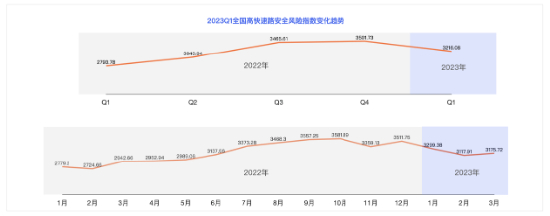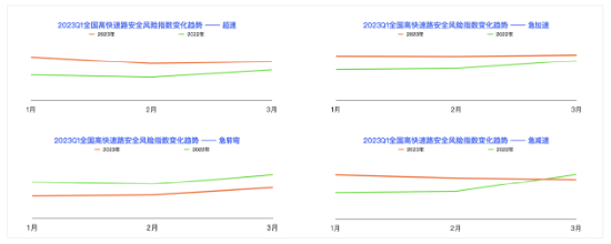 数据显示,全国高快速路的安全⻛险指数环比2022第四季度下降8.16%,全国高快速路的危险驾驶行为(即三急⼀超:急加速、急减速、急转弯和超速)与2022第一季度比较,超速、急转弯的变化趋势一致,急加速、急减速则在2023年3月呈现下降向好趋势。